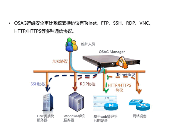 天锐锋OSAG Manager提供了RDP、Telnet、SSH、VNC、HTTP、FTP等协议的支持。可审计设备包括:Unix、Linux、Windows等系统的服务器、各类网络及安全设备、应用系统web管理后台。如下图所示: