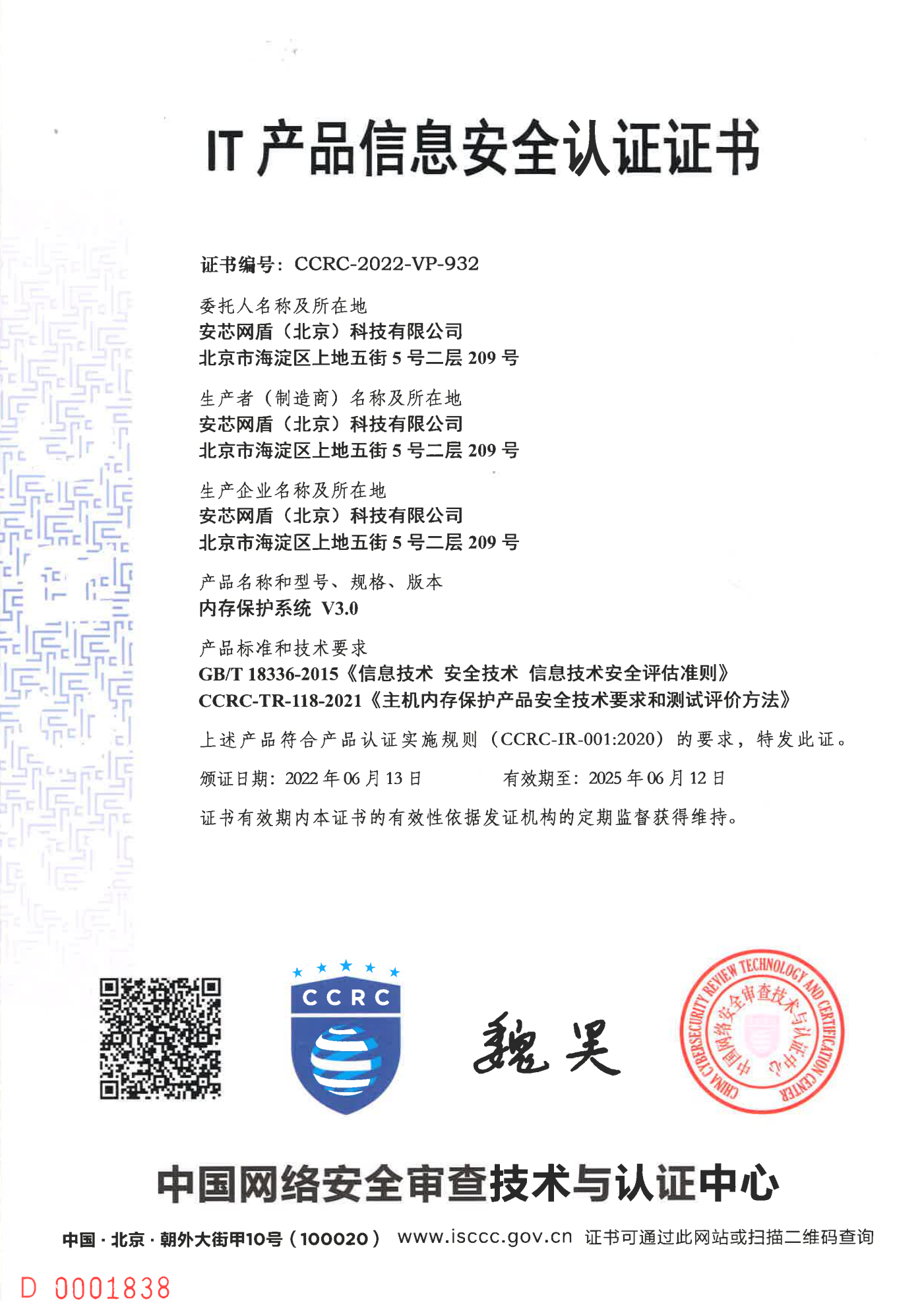 安芯网盾自主研发的“内存保护系统V3.0”顺利通过中国网络安全审查技术与认证中心(ISCCC)的安全评价,荣获《IT产品信息安全认证证书》。 ISCCC是由国务院信息化工作办公室、国家认证认可监督管理委员会等八部委授权,负责实施信息安全认证的专门机构。IT产品信息安全认证是ISCCC依据信息技术安全性评估准则和相关技术要求,对IT产品安全性所进行的评价。 2022年6月,安芯网盾牵头制定业内首份《...