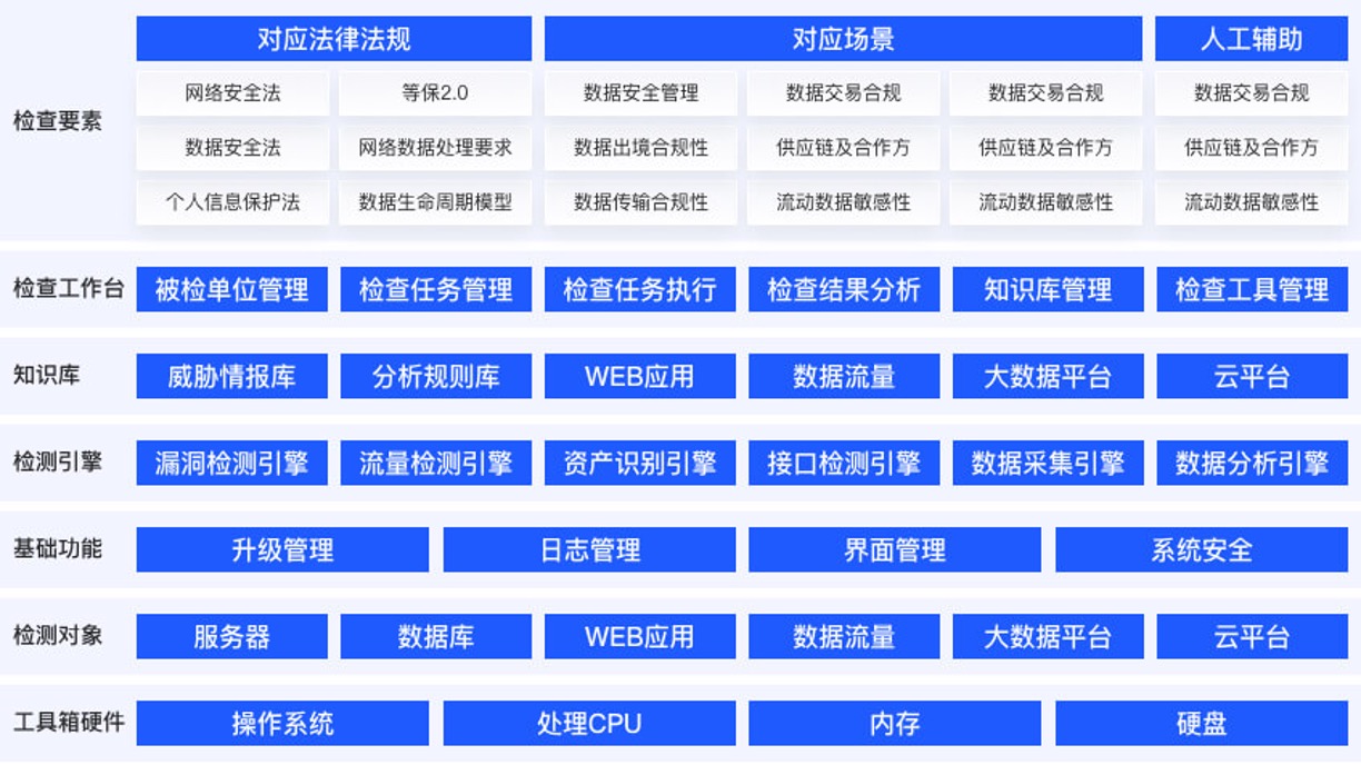 AiCheck数据安全评估系统 数据安全|检查评估 |数据识别|远程扫描|流量监测 AiCheck数据安全评估系统(数据安全检查工具箱)是一款面向监管单位、三方测评机构、企事业单位开展数据安全风险检查、合规评估的支撑工具。工具箱基于丰富的合规知识库、全面的检查工具集,围绕数据采集、传输、存储、处理、交换、使用等环节,以及数据出境、转移等应用场景,快速、有效识别静态或流动中数据的潜在风险、违法违规事...