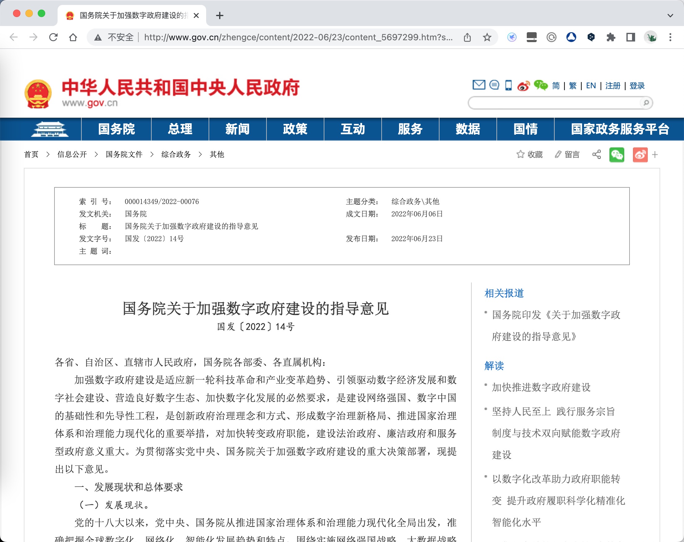 国务院关于加强数字政府建设的指导意见 国发〔2022〕14号 各省、自治区、直辖市人民政府,国务院各部委、各直属机构: 加强数字政府建设是适应新一轮科技革命和产业变革趋势、引领驱动数字经济发展和数字社会建设、营造良好数字生态、加快数字化发展的必然要求,是建设网络强国、数字中国的基础性和先导性工程,是创新政府治理理念和方式、形成数字治理新格局、推进国家治理体系和治理能力现代化的重要举措,对加快转变政...
