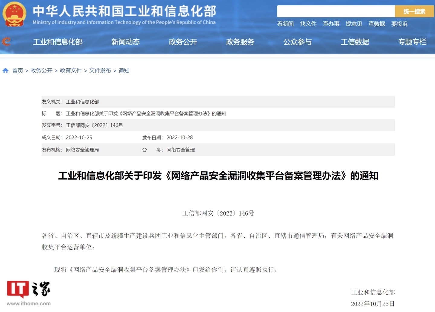 工信部印发《网络产品安全漏洞收集平台备案管理办法》,2023年1月1日起施行