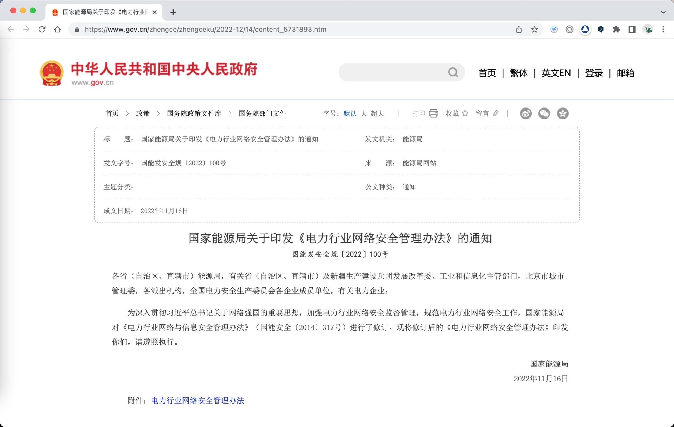 国家能源局关于印发《电力行业网络安全管理办法》的通知 国能发安全规〔2022〕100号 各省(自治区、直辖市)能源局,有关省(自治区、直辖市)及新疆生产建设兵团发展改革委、工业和信息化主管部门,北京市城市管理委,各派出机构,全国电力安全生产委员会各企业成员单位,有关电力企业: 为深入贯彻习近平总书记关于网络强国的重要思想,加强电力行业网络安全监督管理,规范电力行业网络安全工作,国家能源局对《电力行...