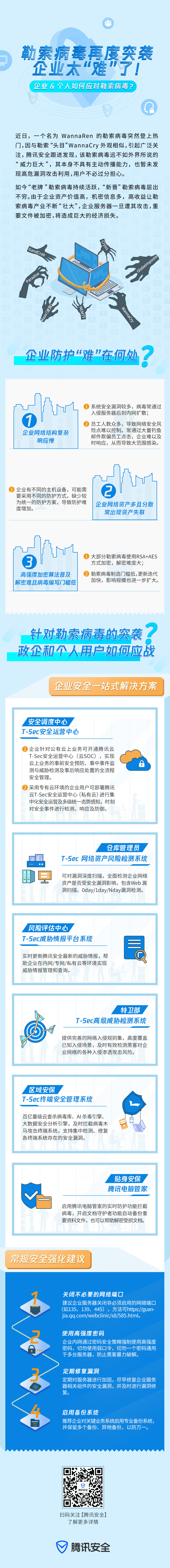 近日,#WannaRen病毒大规模传播# 的消息成为热门,虽然据腾讯安全跟进发现,WannaRen的“威力”并非热传的如此巨大,但近年勒索病毒热度不减,仍在全球肆虐,成为威胁企业安全的重点隐患之一。面对勒索病毒的突袭,腾讯安全能提供一站式安全解决方案及常规安全强化建议,帮助企业随时“应战”↓↓↓