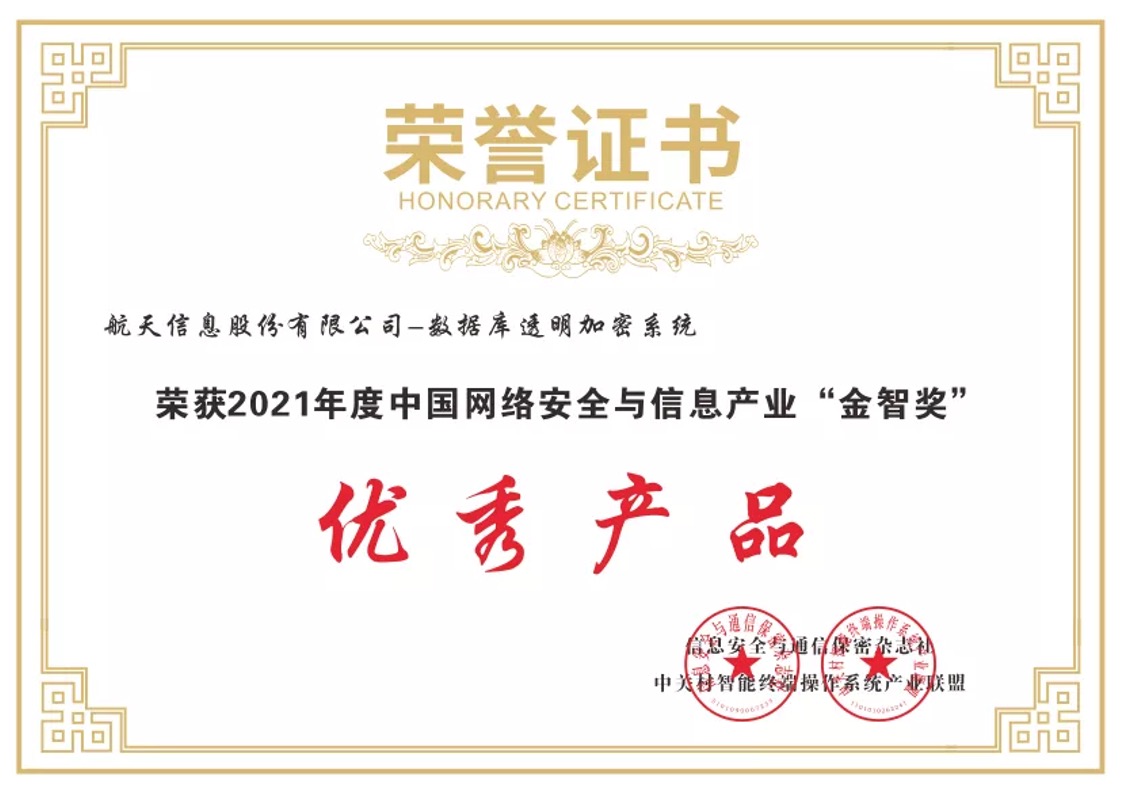 近日,由信息安全与通信保密杂志社主办,中关村智能终端操作系统产业联盟协办的2021年度(第六届)“中国网络安全与信息产业金智奖”(以下简称“金智奖”)评选结果公布,航天信息股份有限公司(以下简称“航天信息”)旗下“航信数据库透明加密系统”在众多参选产品中脱颖而出,斩获“优秀产品奖”。 本届“金智奖”在参选企业的大力支持和业界同仁的广泛关注下,共有近百家企业、120余位专家评委、50余位媒体评委以及...