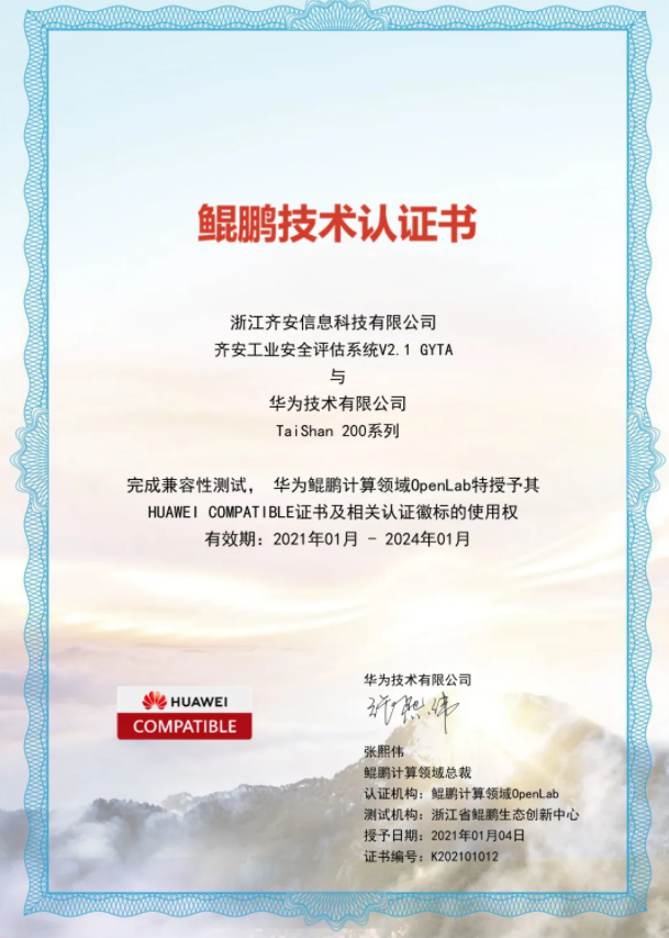 近日,齐安科技产品“工业安全评估系统V2.1”与华为鲲鹏完成兼容性认证,获得华为鲲鹏计算机领域OpenLab授予的HUAWEI COMPATIBLE证书及相关认证徽标的使用权,正式成为华为鲲鹏合作伙伴。 华为鲲鹏认证 面对市场上多样化的ICT产品和解决方案,客户迫切需要高效的解决方案应对业务挑战。为了满足多样化的需求,华为面向伙伴开放 Huawei Compatible、Huawei Valida...