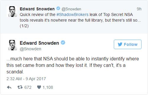爱德华·斯诺登今天通过The Intercept网站公布了一批NSA新文件。其中一份文件证实了一周之前黑客泄露并且叫卖的NSA(美国国家安全局)攻击软件的真实性。上周六,名为“影子经纪人”的黑客小组在互联网上公开叫卖他们获得的NSA攻击软件和脚本。