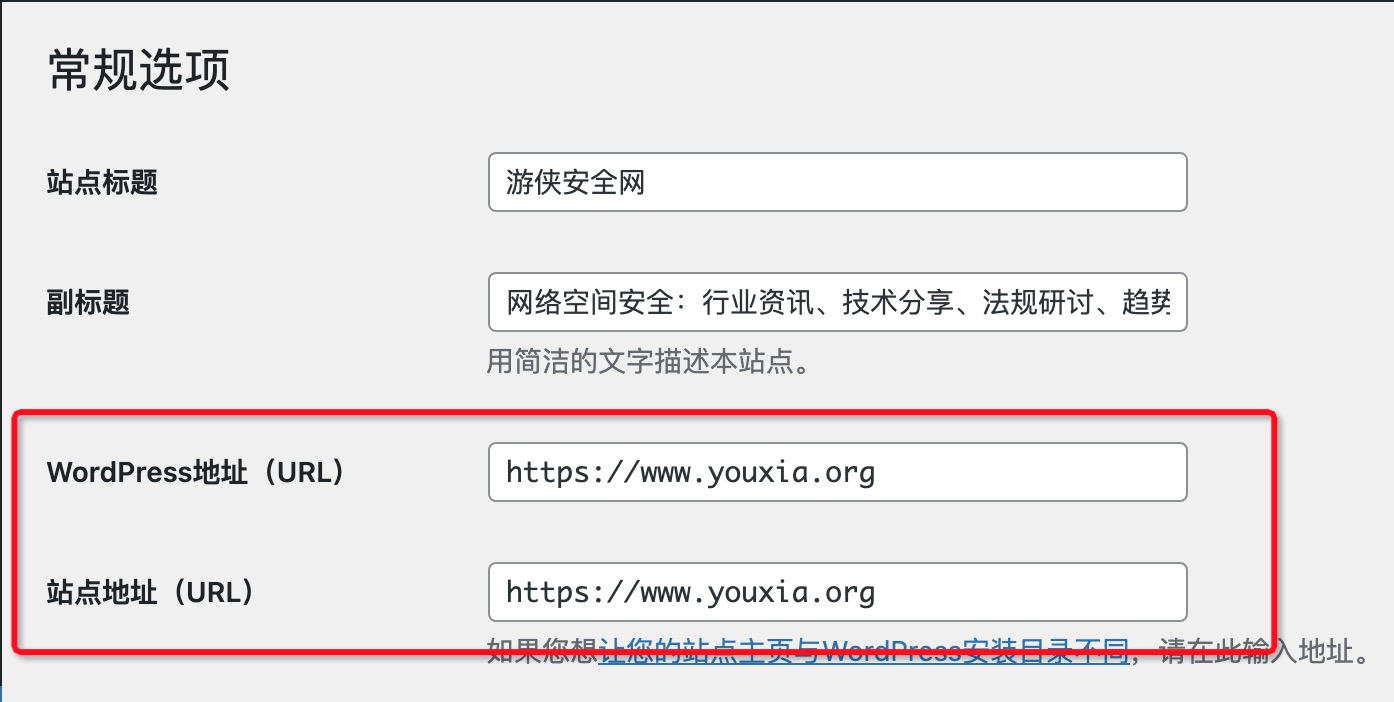 相信各位使用WordPress的站长都知道,后台的“设置-常规”中,“WordPress地址(URL)”和“站点地址(URL)”是“极为相似”的,相信大多数站长都和游侠一样,默认就输入2个一样的URL了,但是实际上,这两个不一样: WordPress地址(URL):在数据库中是siteurl。指的是网站前端的访问地址,也就是说:这是前台地址; 站点地址(URL):在数据库中是home。是给管理员访...