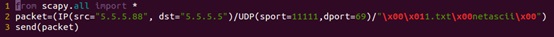 (1)如图所示,在脚本tftp-reflect-attack.py中伪造源IP为5.5.5.88,向tftp服务器发送Read Request 请求: