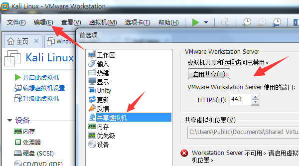 “编辑”→“首选项”→“共享虚拟机”,关闭!收工,再察看端口,443已经不被占用了。