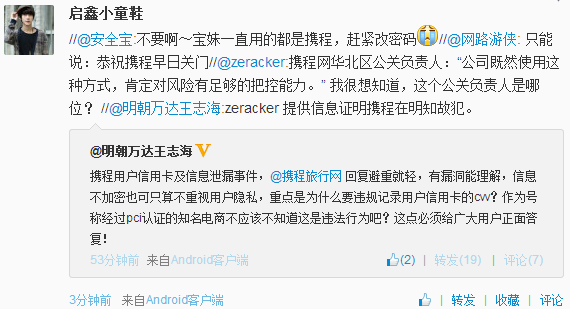 当记者追问携程网客服人员口头索要信用卡有效期、CVV2码等敏感信息,如何保障内部员工不泄露时,这名负责人称此举也系国际通用做法,“公司既然使用这种方式,肯定对风险有足够的把控能力。”而对于记者提出的“携程网是否违反银联规定,在后台保存了用户信用卡相关信息”时,对方未予明确回答。(如何保证的?足够的把控能力……既然足够,这次为什么被爆出来了呢?)
