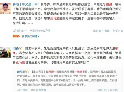 继当当、京东、1号店账户被盗事件后,用户爆料亚马逊中国发生多起账户被盗事件。用户阳先生投诉,其亚马逊中国账户在上周五夜间被盗,立刻投诉,但至今未得到处理,盗号者已成功购买一部手机。据阳先生反应,亚马逊中国某客服告诉他,自上周以来,亚马逊中国有“很多用户”账户被盗,该客服专员本人即处理了四、五起本类事件,而该客服中心有300名员工。